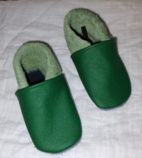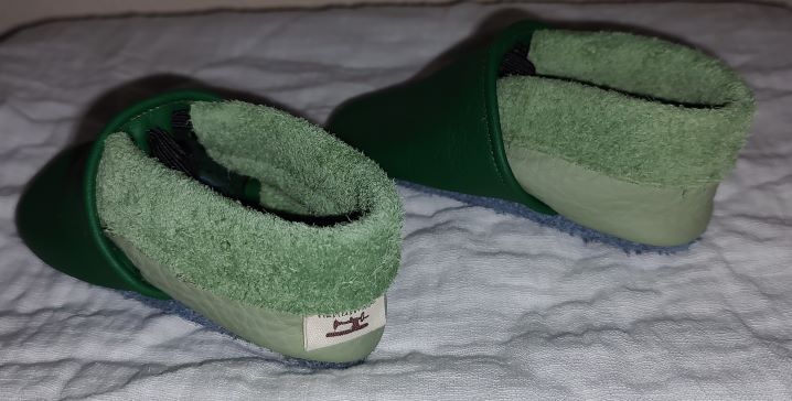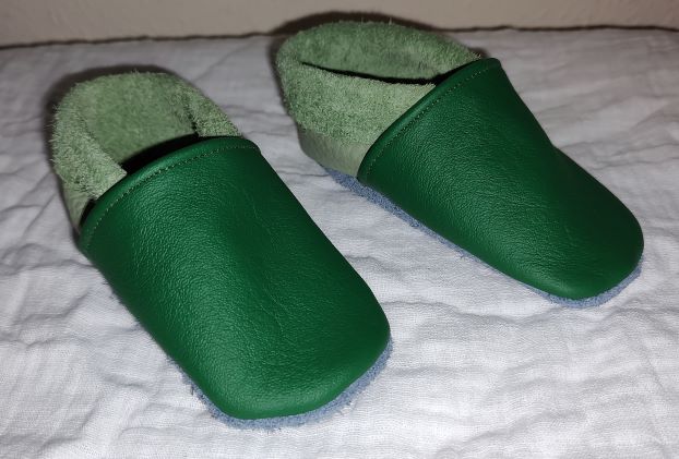 Diese Lederpuschen sind aus hellem und dunklen grünen Leder genäht. Sie haben die Größe 22.