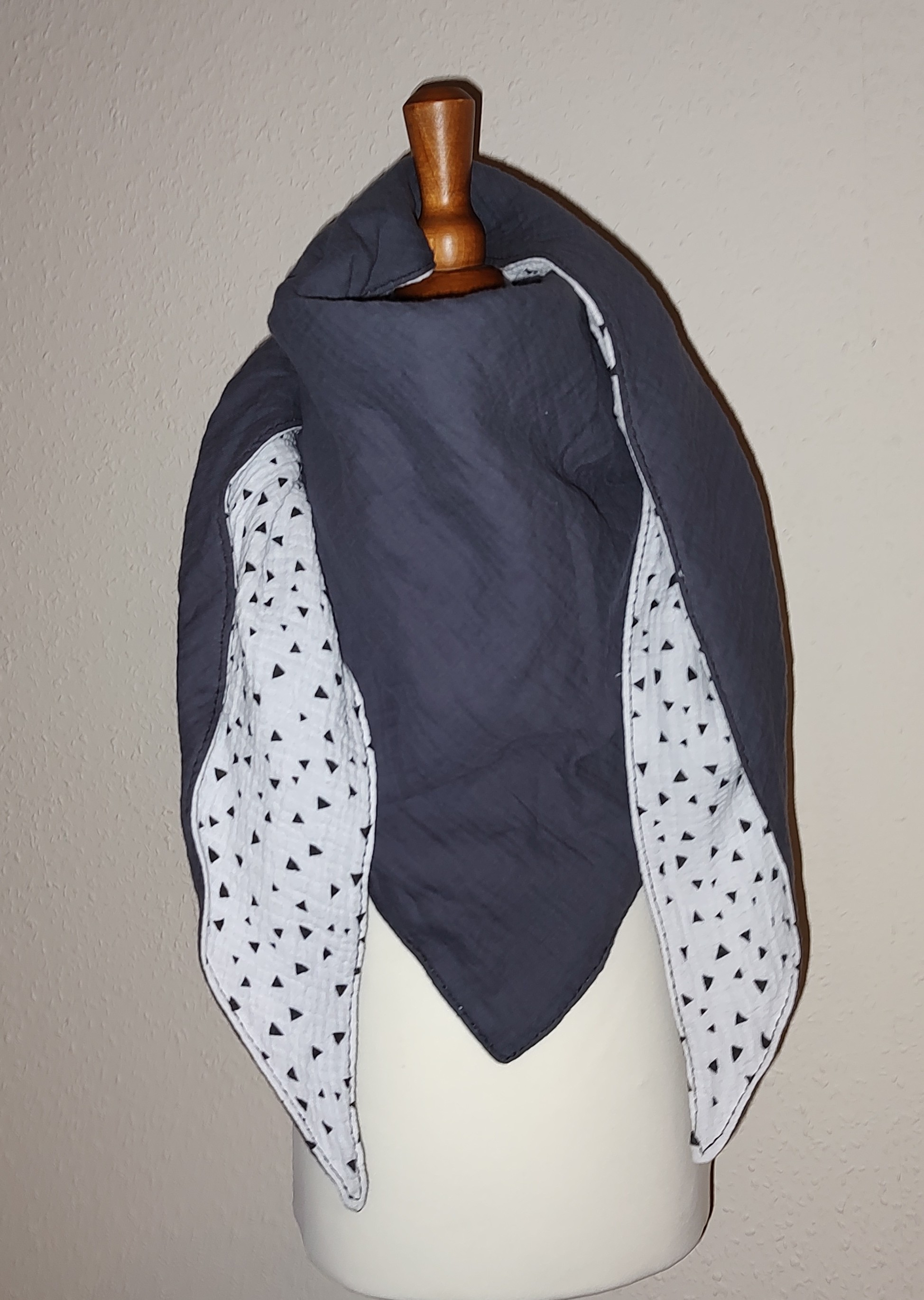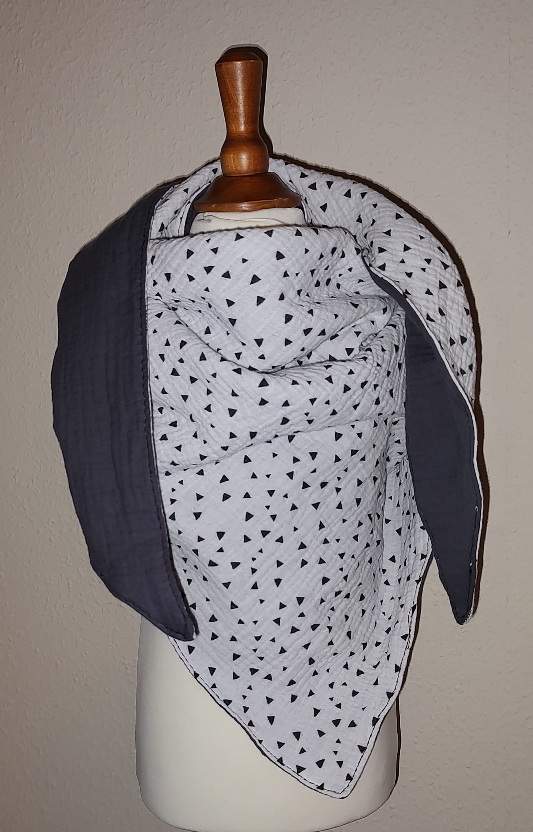 Dieses XL Musselintuch ist für Kinder. Eine Seite ist anthrazit die andere Seite weiß mit anthraziten Dreiecken. An der längsten Seite hat es ein Maß von ca 1,40m. Es ist ist doppellagig und dadurch ergibt sich ein schönes Volumen!