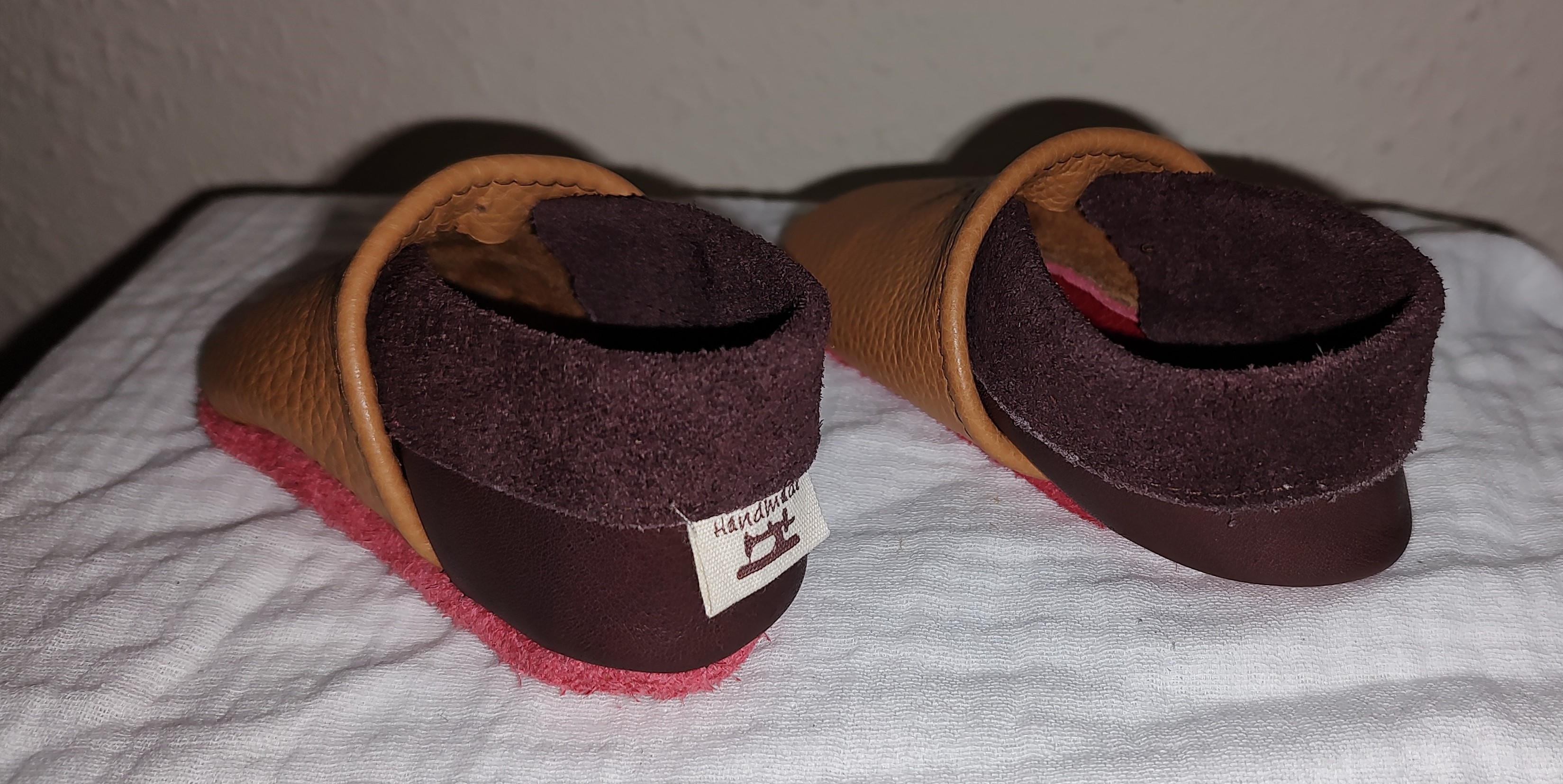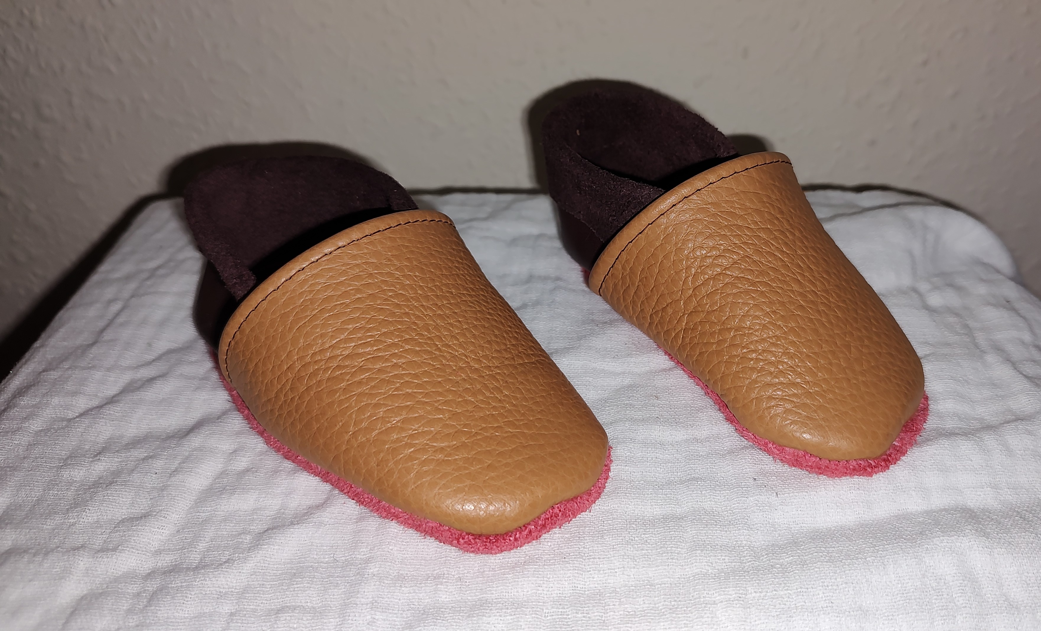 Diese Lederpuschen sind aus hellem und dunkelbraunen Leder genäht. Sie haben die Größe 21.