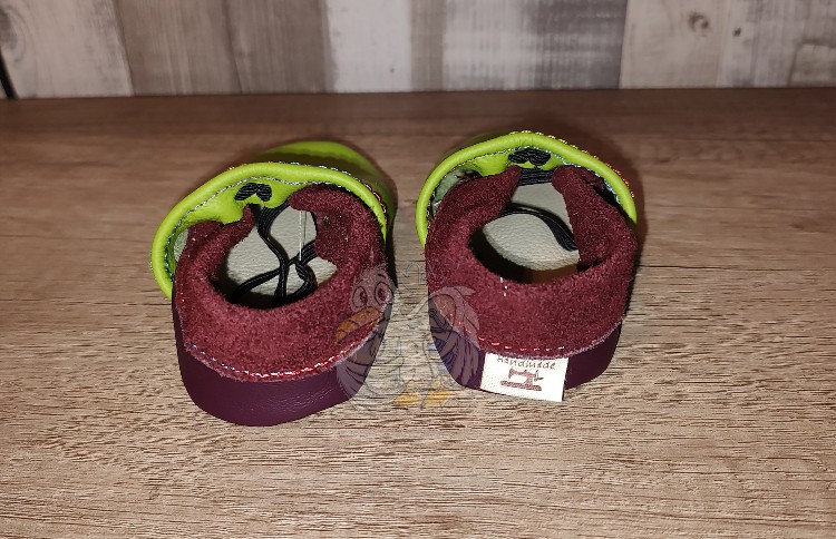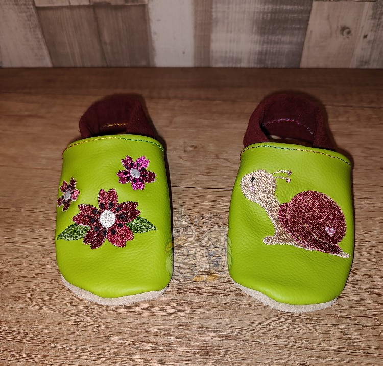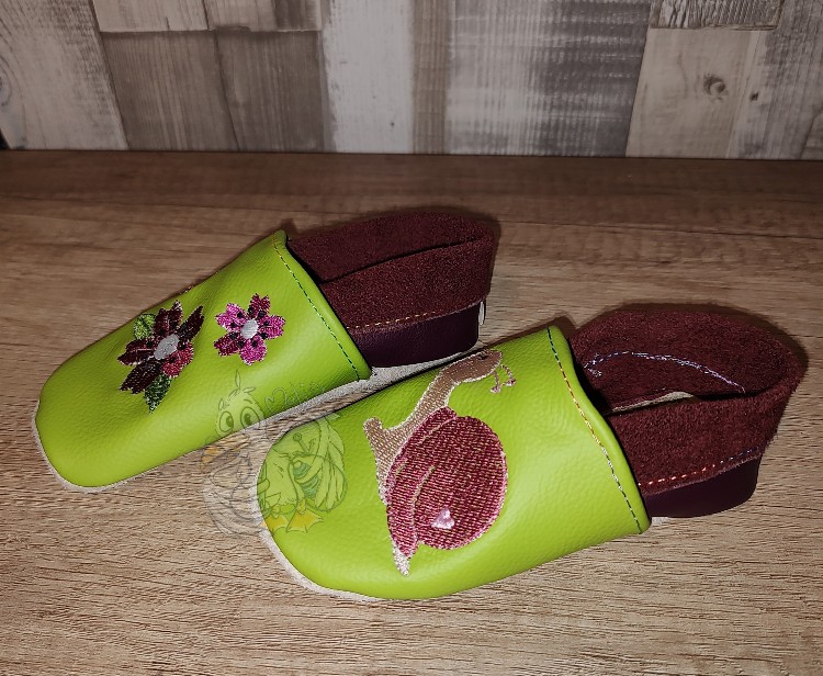 Diese Lederpuschen sind aus hellgrünem und dunklem bordeaux Leder genäht. Sie haben die Größe 25 und sind mit einer niedlichen Schnecke und Blumen bestickt.