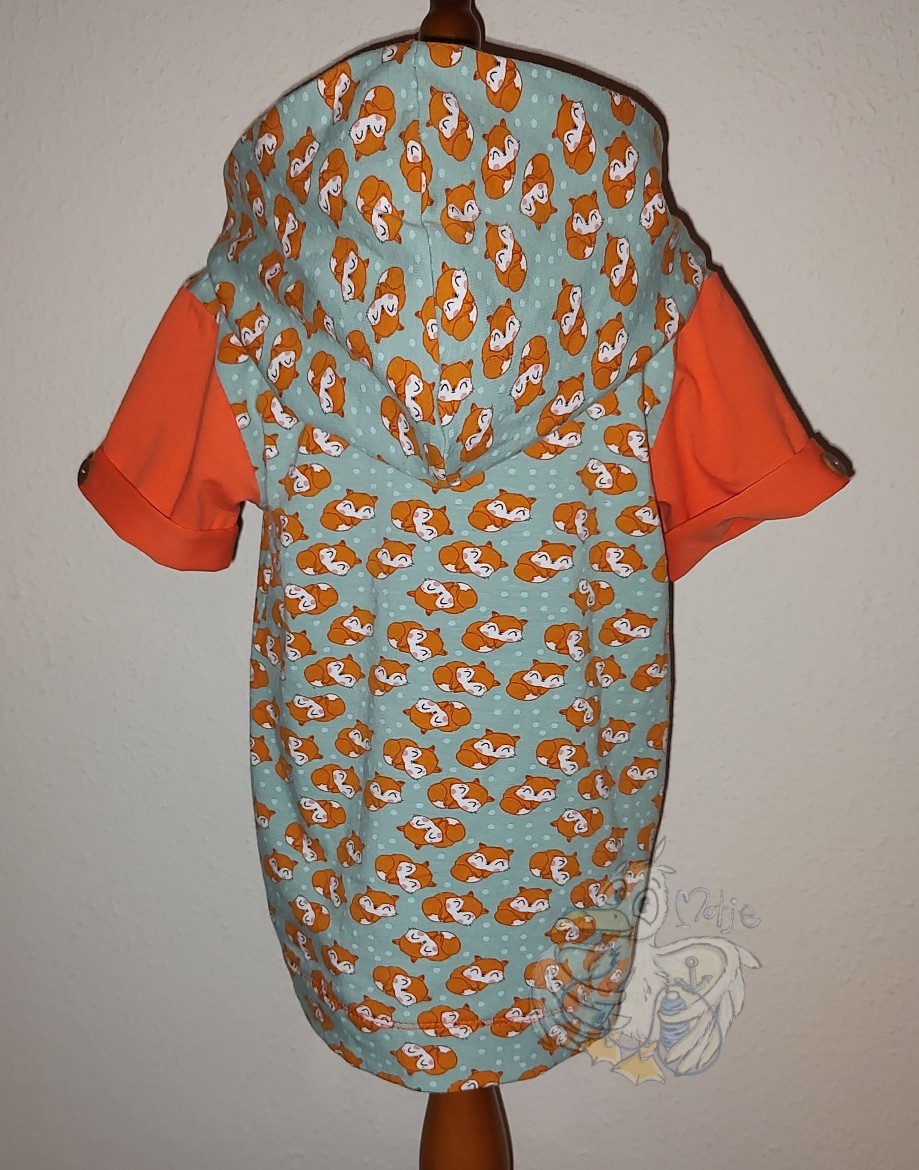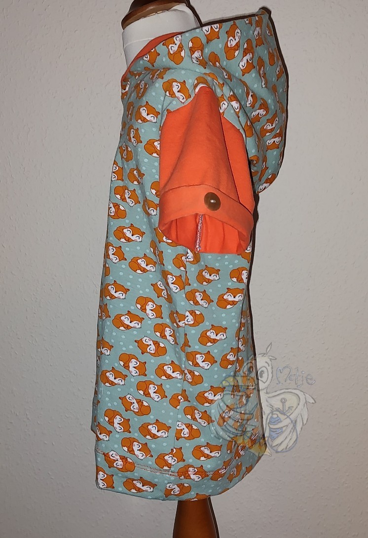 Das Shirt hat Krempelärmel und sitzt locker, aber nicht oversize und hat eine Kapuze. Ich habe es in der Größe 104 genäht. An den Krempelärmel hab ich Knöpfe angebracht, da es nur "Fakekrempel" sind.