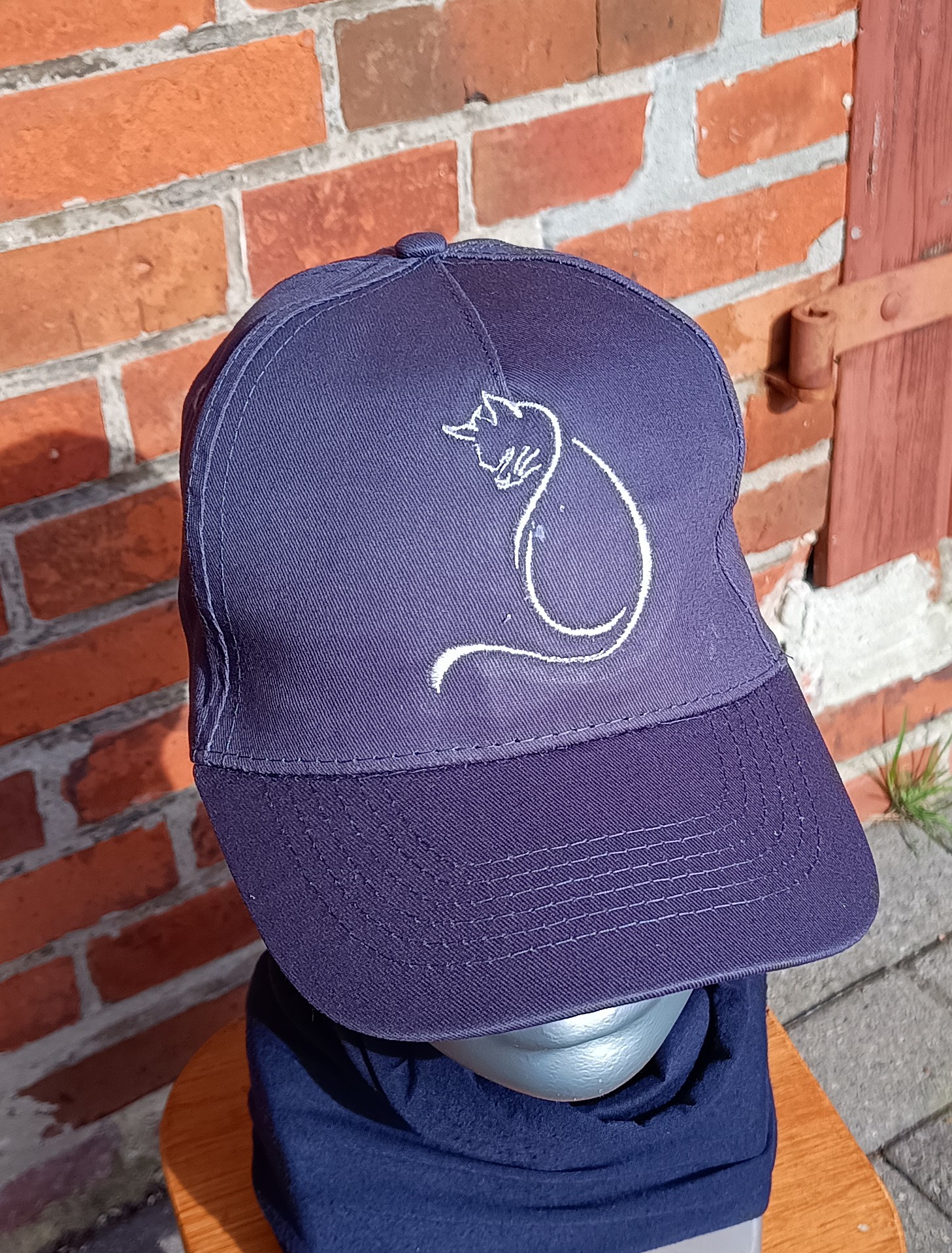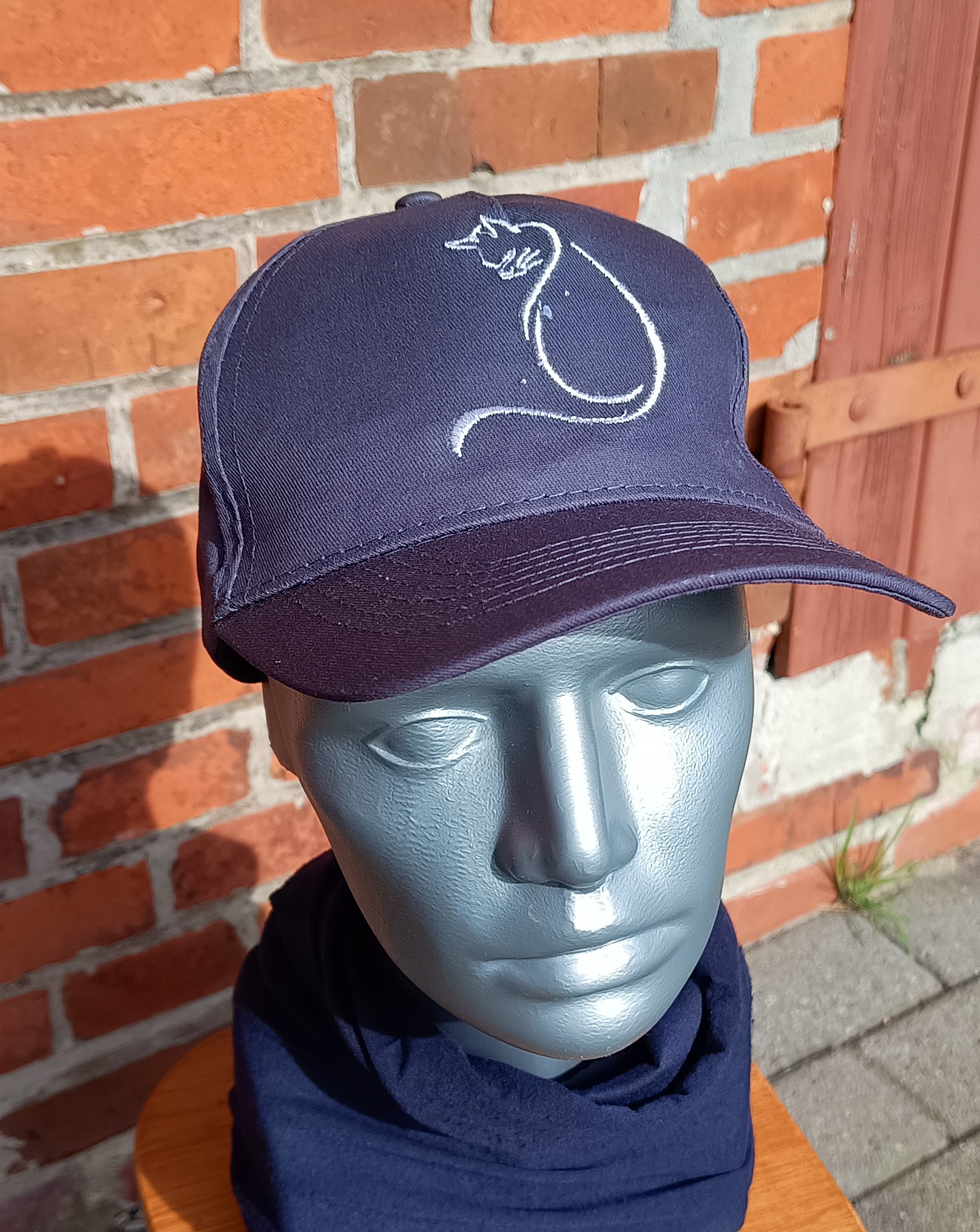 Diese dunkelblaue Kappe habe ich mit einer hübschen Katze bestickt, also was für die Liebhaber kleiner Samtpfoten. Die Kappe ist hinten mit einem Klettverschluss zu schließen und somit der Kopfgröße anzupassen.