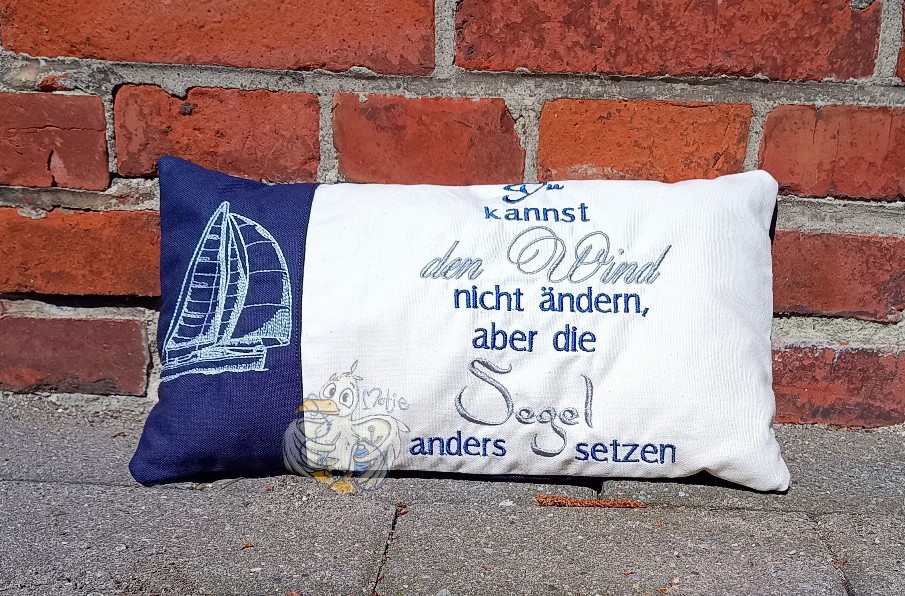 Dieses kleine maritime Kissen hat ungefähr die Maße von 20x30 cm. Es ist komplett an der Stickmaschine gefertigt worden. Der dunkelblaue Canvas ist mit einem Segeschiff bestickt und die naturfarbenden Canvas mit einem Spruch. Die Rückseite ist mit einem Hotelverschluß versehen, so daß die Kissenhülle gewaschen werden kann. Das Füllkissen hab ich aus Futterstoff gefertigt und ist auch an der Stickmaschine gefertigt.