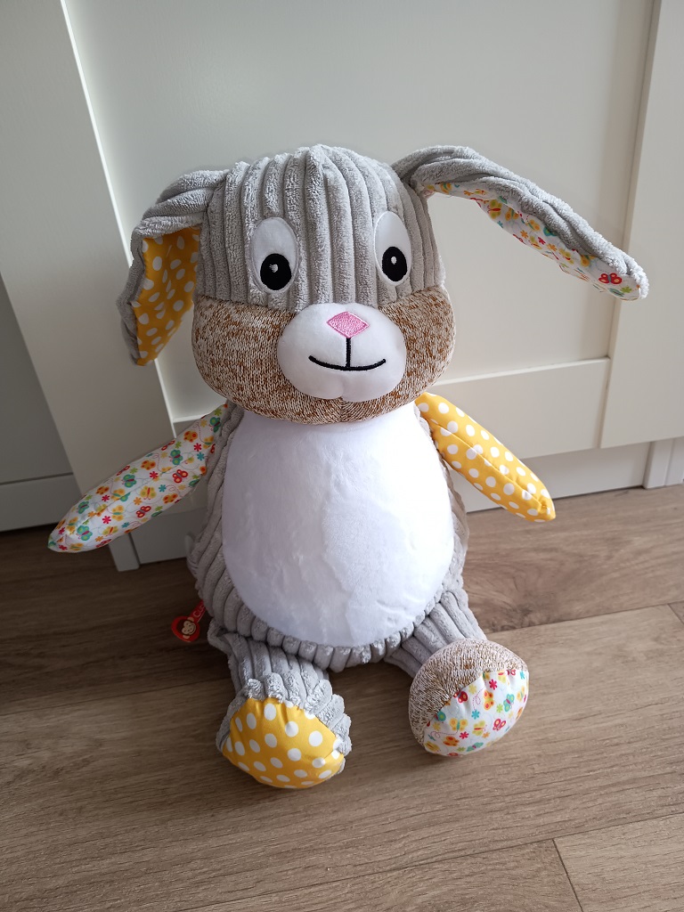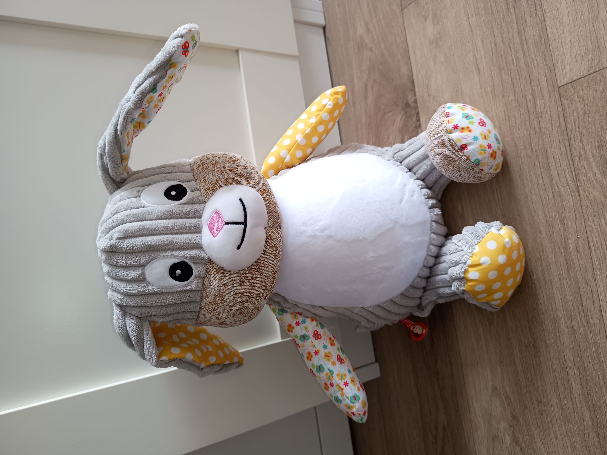 Hier hätten wir einen wunderschönen Hasen aus kuscheligen Breitcord. In den Ohren ist Knisterfolie verarbeitet. Die Ohren, Arme und Fußsohlen bestehen aus gelben Stoff mit Punkten und Schmetterlingen. Die Schnauze und Füße aus Strickstoff (Preis ist inkl. Wunschname, bitte bei der Bestellung mit angeben)